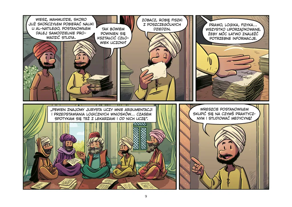Podczas lektury obserwujemy, jak Awicenna stopniowo tworzy swój „Kanon medycyny”, począwszy od tego, jak uzyskał dostęp do biblioteki sułtana. Po barwnej komiksowej opowieści przychodzi pora na garść faktów. Jest to swego rodzaju biogram porządkujący według dat wydarzenia z komiksu. Poza samym Awicenną w zakończeniu mamy w paru zdaniach przybliżone sylwetki również innych wybitnych islamskich naukowców. Prawdopodobnie ich nazwiska nie są wam znane, mimo że także mieli swój wpływ na rozwój wielu dziedzin naukowych. Sama książka jest kolorowa i sprawdzi się zarówno podczas samodzielnego czytania, jak i wtedy, kiedy to rodzice chcą opowiedzieć dzieciom o ciekawych dokonaniach naukowych.